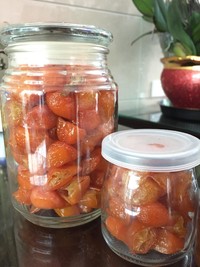 晒过或者烤过的金桔会呈橙红色,表面因为有糖浆,所以亮亮的很漂亮。