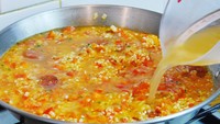 下烟熏红椒粉、米和藏红花继续翻炒2分钟