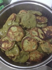 把荠菜榨汁,和粘米粉糯米粉混合在一起揉匀。