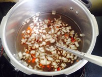 姜丝过油炒,接着放香菇红萝卜丁炒香后倒入介子高汤中。加米。放高压锅中加入虾米干贝丝煮开后,盖上高压锅压20分钟(省去砂锅小火慢熬步骤)。