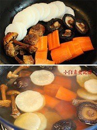 白萝卜和胡萝卜去皮切片,干香菇干姬松茸用水泡发后洗净,一起放入锅中,加足量水大火烧开后转小火慢炖半小时以上做素高汤