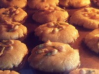 茉莉酥:分别将面团分成小块,双手团成圆形再压扁,放入烤盘中。最后,把泡软的茉莉花压到酥饼上。 桃酥:面团中加入核桃碎揉均匀。分别分成小块,团成球形再压扁,放入烤盘中。