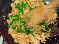 各种配料放上去,然后把煮好的饭也放上去一起炒,要加适量的油。这样才不会粘锅。 饭和配料均匀后,放上剩下的香葱。