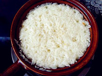 沙煲底部抹薄薄一层油,将香米、清水以1:1.5倒入沙煲中。
