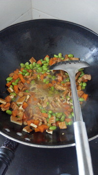 热锅冷油,放入葱爆香后加入猪肉,加点生抽上色,待猪肉微微发黄后加入刚刚煮好的黄豆和胡萝卜丁