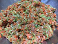 猪肉剁碎,加适量的盐和酱油,葱姜末,香油食盐和鸡精拌均匀。加入过滤后的花椒油和海米