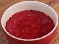 将覆盆子酱稍加处理,将200g的覆盆子酱倒进锅里加热,边加热边搅拌,当温度到45℃的时候,将细砂糖20g和果胶粉5g加入锅中,用电动搅拌器将两者充分混合均匀,继续加热直至烧开,然后将覆盆子酱倒出,冷却到20℃以下就可以了
