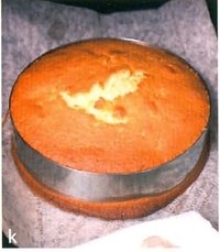 4、 烤盘铺油纸,放上15cm空心圆模,或者用6寸活底戚风蛋糕模替代。 注意:书上写的是“为了不让蛋糕在烘烤时内缩,模具内部不涂油”,所以我估计没有空心圆模的话,直接用戚风蛋糕模也是可以的。