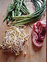 豆角,蒜薹,五花肉,豆芽挑好,洗净