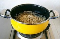 将豆腐丝漂洗四、五遍,然后放入开水锅中烫一遍,捞起,再浸入盛满水的盆中备用