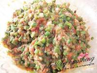 晾凉的炸酱和肉馅儿搅拌均匀,加入豆角稍微搅拌一下,尝一下咸淡,加一些香油。