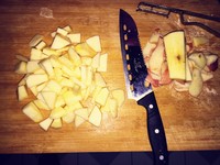 当汤圆全部飘起加入苹果加入适量糖