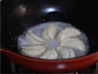 平底锅中放少许底油,热油后,摆上饺子,小火煎把饺子底部煎定型