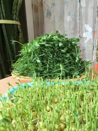第十三天,收获豆苗!记得不要剪到根部,要留下最下面的小芽,因为还可以再长出新的豌豆苗来,可以收三茬呢!拭目以待!