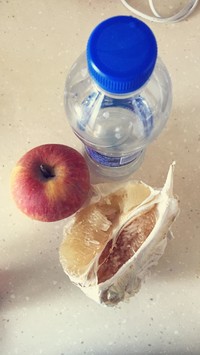 苹果削皮切成小块,柚子剥一瓣去皮掰成小块,放入搅拌机,倒入小半瓶矿泉水。