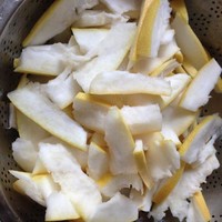 先用食盐将柚子皮的表层搓干净后切大小厚薄均匀的片状,第一道加适量的淡盐水里泡,泡到水的颜色变黄(约两个小时)取出把柚子皮里的水分挤干,这样可去掉皮上苦涩的味道