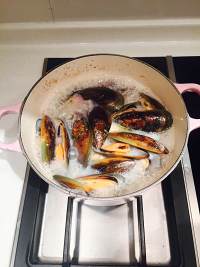 倒入白葡萄酒,搅拌一下。 倒入青口,盖上锅盖,闷至青口开壳。 (我买的是超市冰冻新西兰,肉质太硬了。建议大家买冰鲜的)