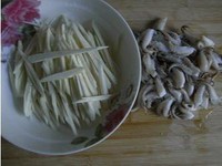 八鱼爪洗净用热水快速烫下再洗净,茭白切丝