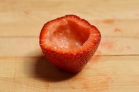 然后用一个小小小勺子小小小心地将草莓中间掏空。Using a melon baller or small measuring spoon, carefully scoop out the insides of the strawberries.