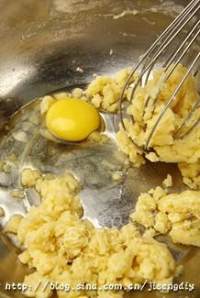加入鸡蛋。(注:面糊温度不要太高,太高会将鸡蛋烫熟)