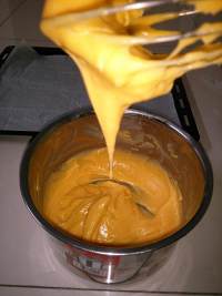 离火后,分三次加入蛋液,搅拌成提起打蛋器出现倒三角为好。