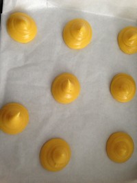 泡芙面糊搞拌好后装在裱花袋中,烤盘先垫好油纸,挤出一个一个小圆坨(有点像便便)哈(记得每一坨留下多一点的间距,因为他能长2倍大)