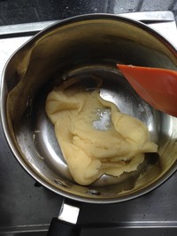 黄油45克+水100克混合煮沸,离火,加入低筋面粉60克搅拌均匀,再放在炉上加热