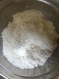 粘米粉、糯米粉和细砂糖称好过筛后用手动打蛋器搅匀