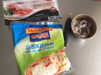放上培根,墨鱼肠,再撒一层马苏里拉。