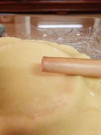 用擀面杖将面团推到0.5cm厚,将面皮覆盖在派盘上再用擀面杖压一下磨具的边,饼底就能完美的扣好了