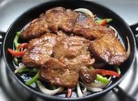 将铁板放入火上烧热,淋入少许油,放入腌制好的梅花肉煎