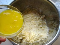 黄油切成1cm左右的小块,软化后,用油面混合器搅拌成包谷面状
