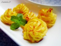 鸡蛋只取蛋黄加入土豆泥,再加入黄油,适量盐和黑胡椒,搅匀调味,放入裱花袋挤出小圆塔的形状。
