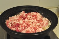 肥肉出油后,把火开略大,放入洋葱丁煸炒到葱香味儿出来。 Tips:如果有红洋葱小的那种,就用红洋葱,会更香,没有普通洋葱也可以啦