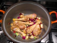少许黄油起锅,将腌制的鸡腿及腌料倒入锅中中火翻炒,至鸡腿表面焦黄。同时预热烤箱和塔吉锅至175度。