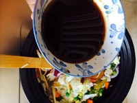 调一碗酱汁儿:生抽老抽蚝油豆瓣酱儿鲜贝露各来一点儿,盐一勺,一起加入搅拌一下。
