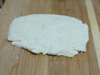 将较干的面团移到案板上,压成约 1.5cm 的扁片,然后用刮刀或刀背从中间切成两半,重叠在一起,在继续按压成1.5cm 的扁片,从中间分开。 以上动作重复4次。