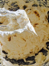 盘中阻力减小,黄油发白膨胀成奶油状。在室温下蛋液分4次倒入盆中,每次都高速打发2~2.5分钟。
