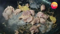鸡腿肉切块,锅里放油,油热后放2片姜,把鸡腿肉稍稍炒香