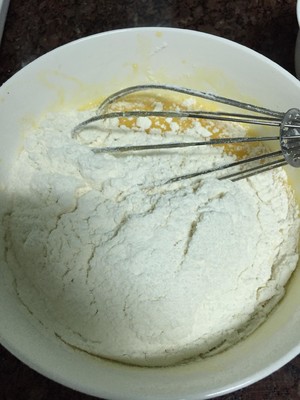 低筋面粉分成两次加入蛋黄液中,搅拌均匀