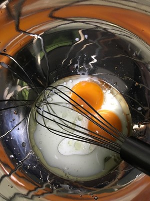 3.将牛奶和色拉油同时倒入蛋黄盆中,用打蛋器搅拌直至所有液体都混合均匀呈浅黄色。
