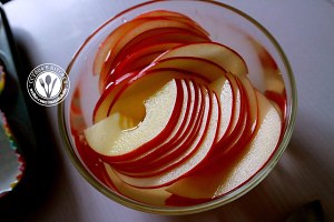 准备一碗清水,碗要足够大,要能把所有切片苹果都浸没的大小哦。在水里倒入一勺(喝汤的勺子)柠檬汁,如果家里没有这样的柠檬汁,可以去买个新鲜柠檬,切开挤半个柠檬的汁进去,这是为了防止苹果片氧化变色,因为有的小伙伴刀功不熟练的话,切得慢,切到最后,前面的苹果都氧化变深了,所以为了颜值,这一步不能省略哦~