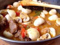 加入白蘑菇继续煮15分钟即可起锅。精细一些的可以捞起肉和白蘑菇,把剩下的汤汁放入搅拌机内打至细滑,倒回锅中煮开浇在肉和蘑菇上,我这不是懒嘛-_,-吃的时候撒上欧芹碎即可。