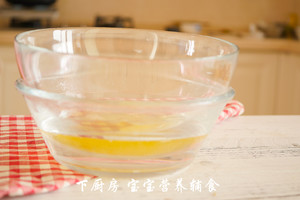 取1/3蛋白霜,加入小米蛋黄糊中。 PS:分次加入可以混合得更均匀,也能防止蛋白霜消泡。