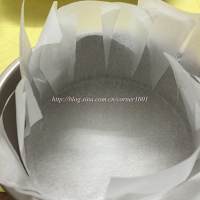 拿出一张油纸和剪刀,如下图,为这个模具做个立体裁剪。无论你用了固底或者活底的模具,这个垫纸必须做。否则,很难拿出来,也不可以倒扣