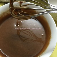 预热烤箱中层160度。将B部分的黄油和巧克力币隔水加热至液体。之后要用冻水将其降温,用手触摸容器底部,不热了,就左手拿黄油液,右手拿着手动打蛋器,将黄油液一点一点成细线状倒入已经做好的A部分的蛋黄液中,边到边搅拌,至其全部混合。