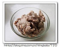 将猪肉切片儿,放淀粉、料酒少许、盐少许腌制