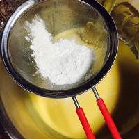 把低粉和玉米淀粉混合过三次筛,分数次加入4蛋黄糊中,边加边搅拌均匀,
