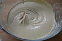 把1/3蛋白加入面糊中,以从底部翻拌的方式混合均匀,再加入剩下的蛋白以同样的方式混合,芝士糊就完成了。 (加入蛋白前的面糊已经冷藏过,应该是有一定浓稠度,表面可以保持一会儿花纹的状态,如果太稀的话混合以后芝士会沉到底部。注意千万不要以画圈的方式混合蛋白,那样会使打发好的蛋白消泡。)