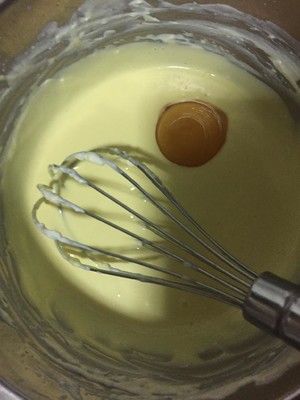 离火离热水,三个鸡蛋分离蛋黄蛋清,蛋黄逐个加入1中搅拌顺滑。